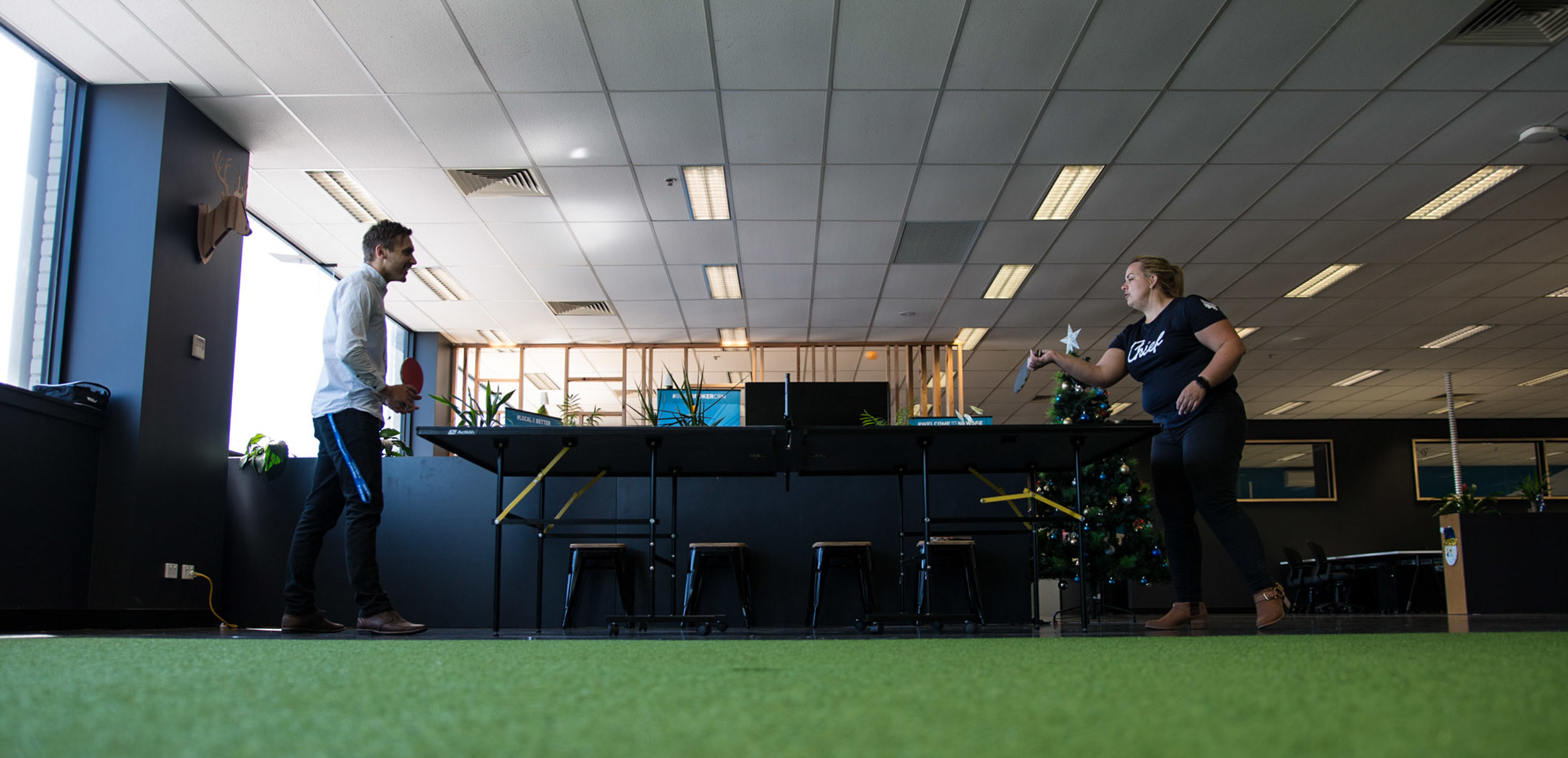 Wellness: Our space provides natural light and greenery as well as restrooms, showers, and lockers. We also offer breakout areas with plush couches, a ping pong table, and a putting green.